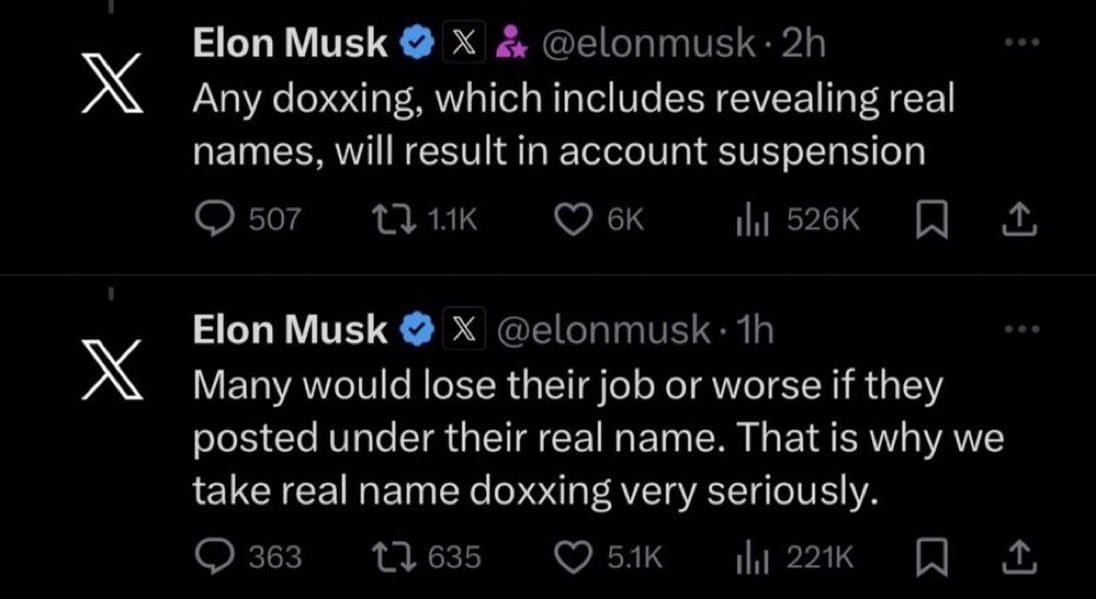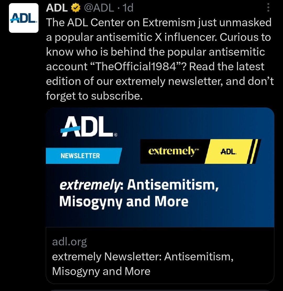 - Platform moderation as surveillance: The ADL’s efforts to pressure social media companies to ban or restrict accounts based on its classifications2. Doxing concerns: Musk’s stated policy that “any doxing, which includes revealing real names, will result in account suspension” reflects genuine privacy concerns when advocacy groups publicly identify individuals3. Selective enforcement: Questions about whether the ADL applies its standards consistently across the political spectrum