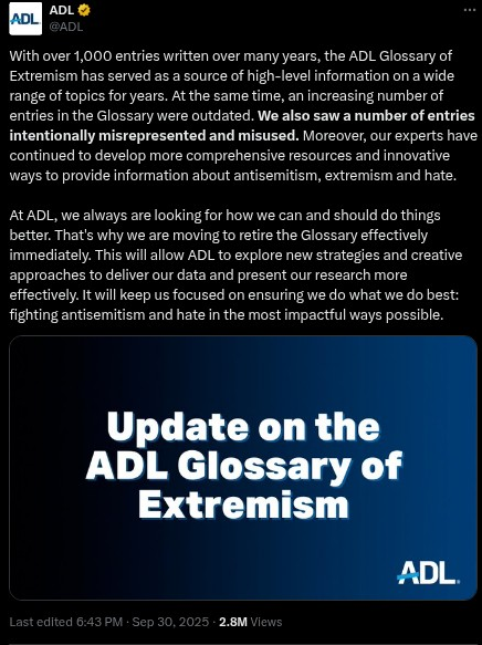 An ADL spokesperson stated: “With over 1,000 entries written over many years, the ADL Glossary of Extremism has served as a source of high-level information on a wide range of topics for years. At the same time, an increasing number of entries in the Glossary were outdated. We also saw a number of entries intentionally misrepresented and misused.”