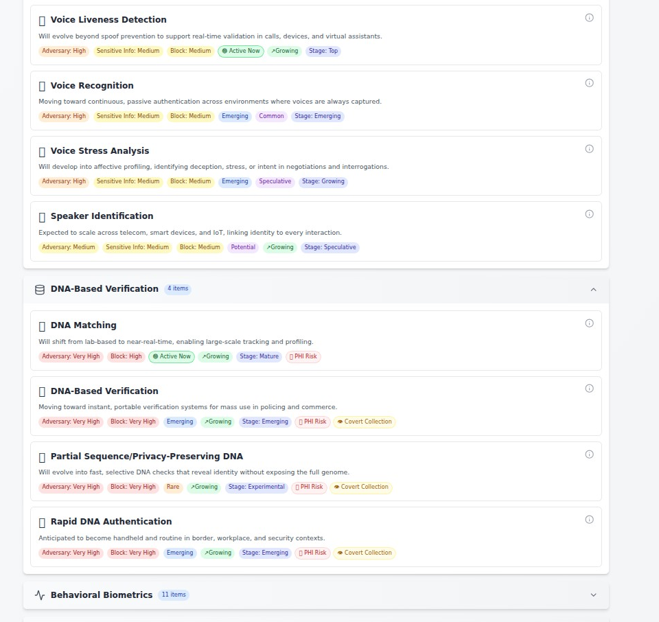 - 🔴 Very High Risk (10 technologies): Including DNA matching, blood chemistry analysis, and breath analysis that can reveal extensive health information and are nearly impossible to block- 🟠 High Risk (18 technologies): Such as iris recognition, gait analysis, and remote vascular imaging that enable persistent tracking- 🟡 Medium Risk (24 technologies): Like typing patterns and mouse movements that reveal behavioral patterns- 🟢 Low Risk (5 technologies): Including signatures and basic interaction patterns with limited privacy impact