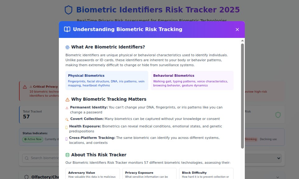 - Browse by Category: Explore different biometric families from ocular to olfactory2. Filter by Risk Level: Focus on the highest threats to your privacy3. Check Deployment Status: See what’s active now vs. what’s coming4. Search Specific Technologies: Research particular biometric systems5. Click for Deep Dives: Get detailed information on each technology