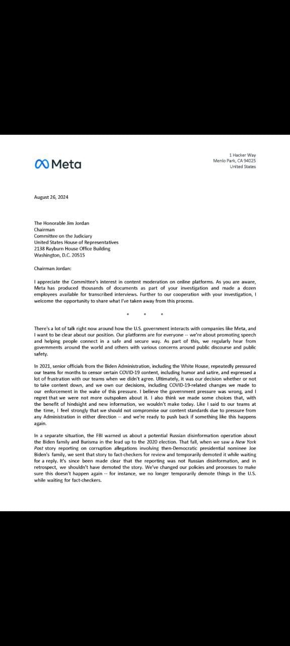 Fast forward to August 2024, and Zuckerberg finds himself once again in the hot seat, this time in the form of a detailed letter addressed to Congressman Jim Jordan. The letter comes as part of an ongoing investigation by the House Judiciary Committee into Meta’s content moderation practices and the extent to which government agencies may have influenced these decisions.