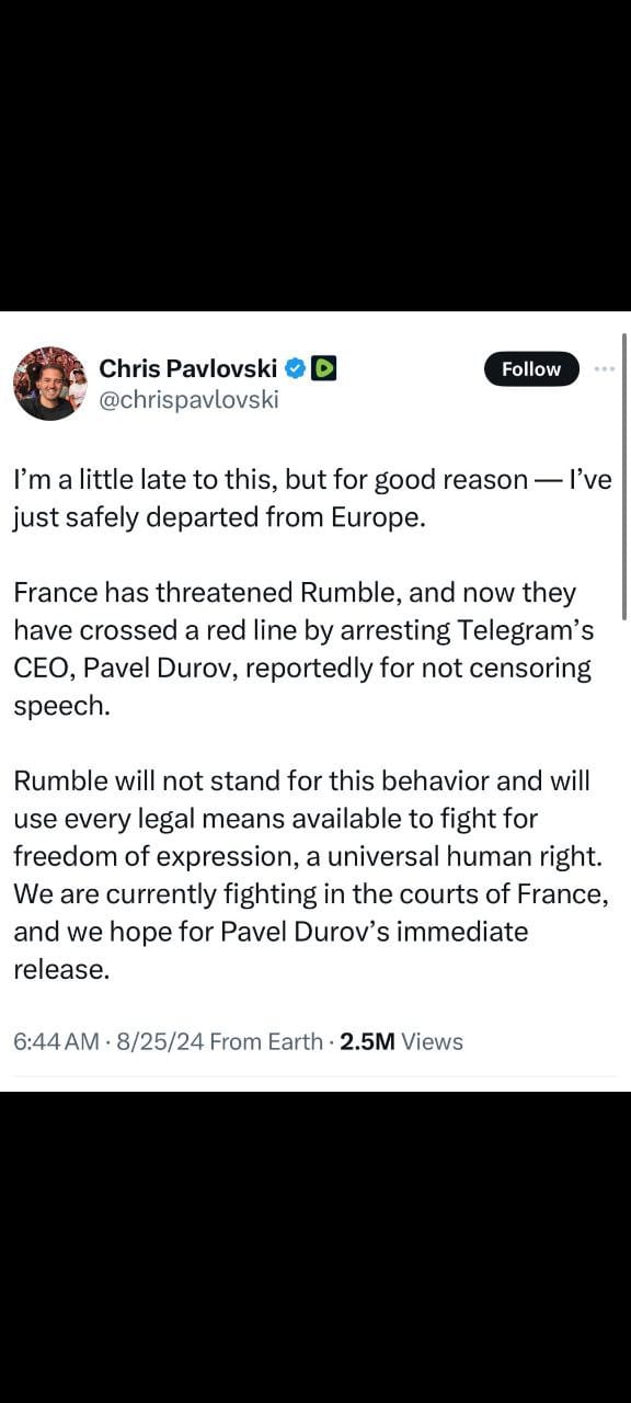 Pavlovski’s post highlights his concern over France’s recent actions, which he describes as a “red line” being crossed. The arrest of Durov, as claimed by Pavlovski, is reportedly due to his refusal to censor speech on Telegram—a platform known for its hands-off approach to content moderation, similar to Rumble’s own policies.