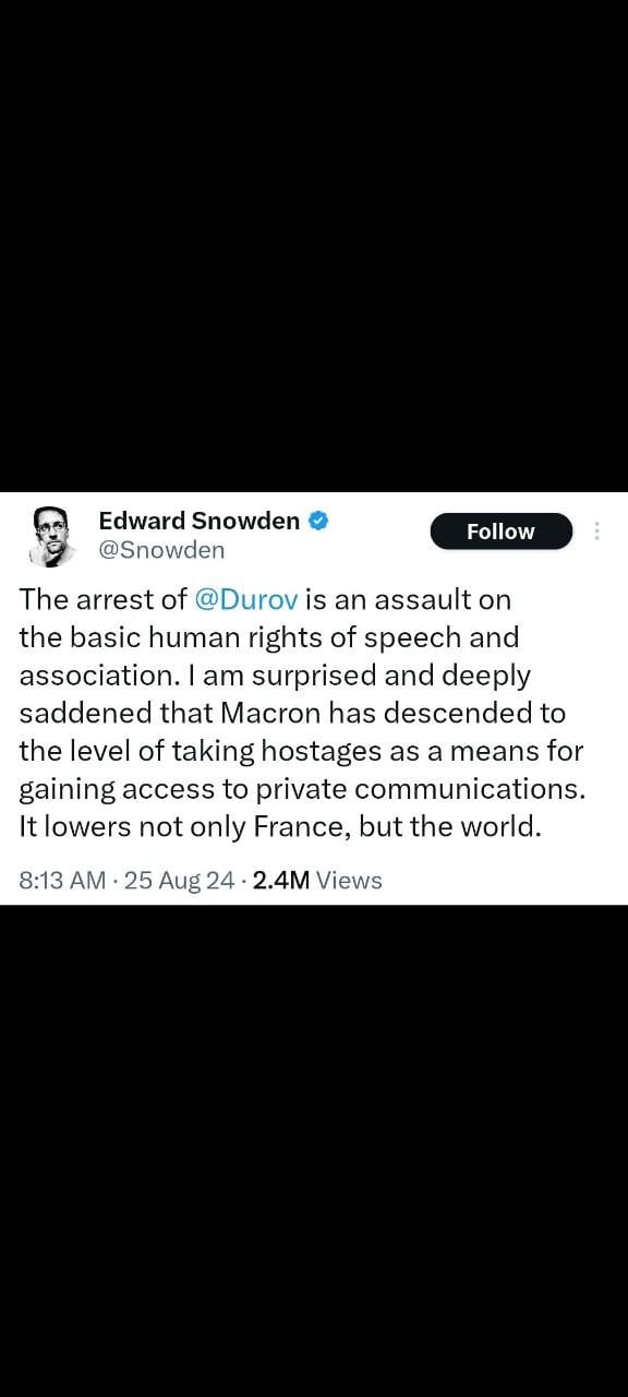 Edward Snowden: Edward Snowden condemned Durov’s arrest, describing it as an attack on fundamental human rights, such as freedom of speech and association. He criticized French President Emmanuel Macron for what Snowden views as a descent into using hostages to access private communications, which Snowden believes undermines not just France, but the world.Marjorie Taylor Greene: Marjorie Taylor Greene declared that free speech is under attack worldwide. She questioned why differing opinions are perceived as threats and called for resolving disagreements openly in public forums.