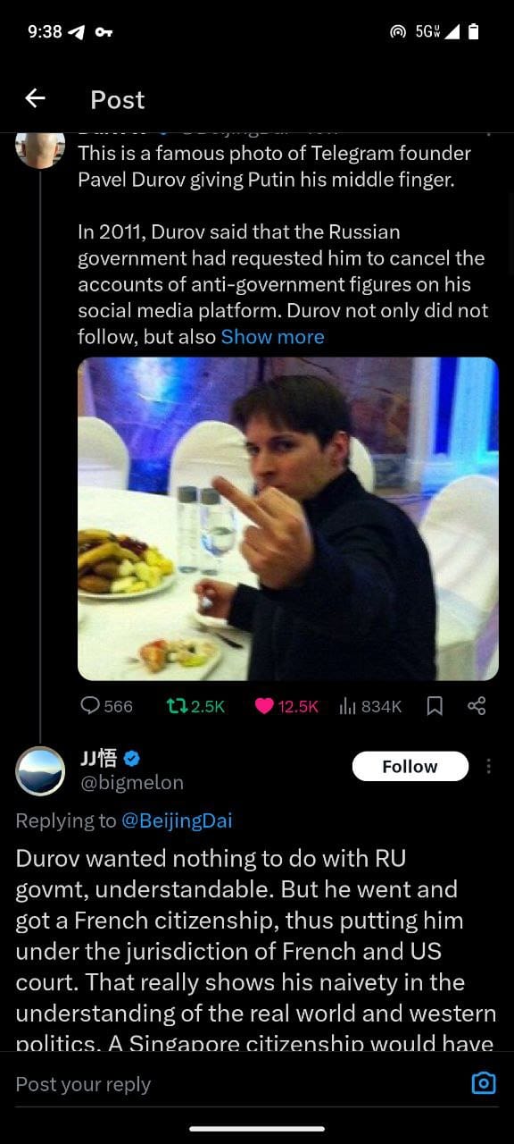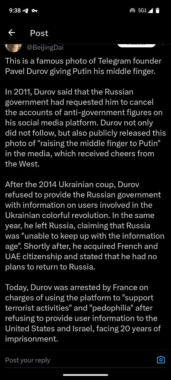 Citations: [1] https://www.aljazeera.com/news/2024/8/26/who-is-telegram-founder-pavel-durov-all-to-know-about-his-arrest-in-france [2] https://www.cnn.com/2024/08/26/tech/pavel-durov-telegram-profile-intl/index.html [3] https://www.theguardian.com/media/article/2024/aug/26/who-is-pavel-durov-billionaire-founder-telegram-mysterious-figure [4] https://vocal.media/01/why-the-russian-founder-of-telegram-gave-putin-the-middle-finger [5] https://simple.wikipedia.org/wiki/Pavel_Durov [6] https://www.themoscowtimes.com/2024/08/26/why-pavel-durovs-detention-shook-both-the-russian-opposition-and-putins-regime-a86147 [7] https://en.wikipedia.org/wiki/Pavel_Durov