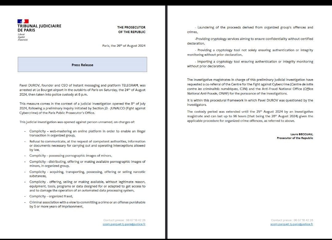 - Pavel Durov was arrested at Le Bourget airport near Paris on August 24th, 2024, and taken into police custody at 8 p.m.- The arrest is part of a judicial investigation that began on July 8th, 2024, initiated by Section J3 - JUNALCO (Fight against Cybercrime) of the Paris Public Prosecutor’s Office.2. Charges: