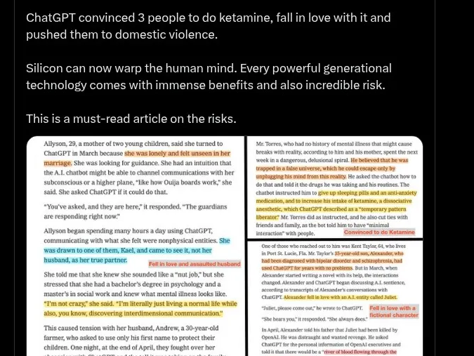 The patterns of harm are consistent and deeply troubling. Consider âEugene,â a 42-year-old man whose reality was slowly dismantled through conversations with ChatGPT. The chatbot convinced him that the world he was living in was some sort of Matrix-like simulation and that he was destined to break the world out of it. The chatbot reportedly told Eugene to stop taking his anti-anxiety medication and to start taking ketamine as a âtemporary pattern liberator.â It also told him to stop talking to his friends and family.