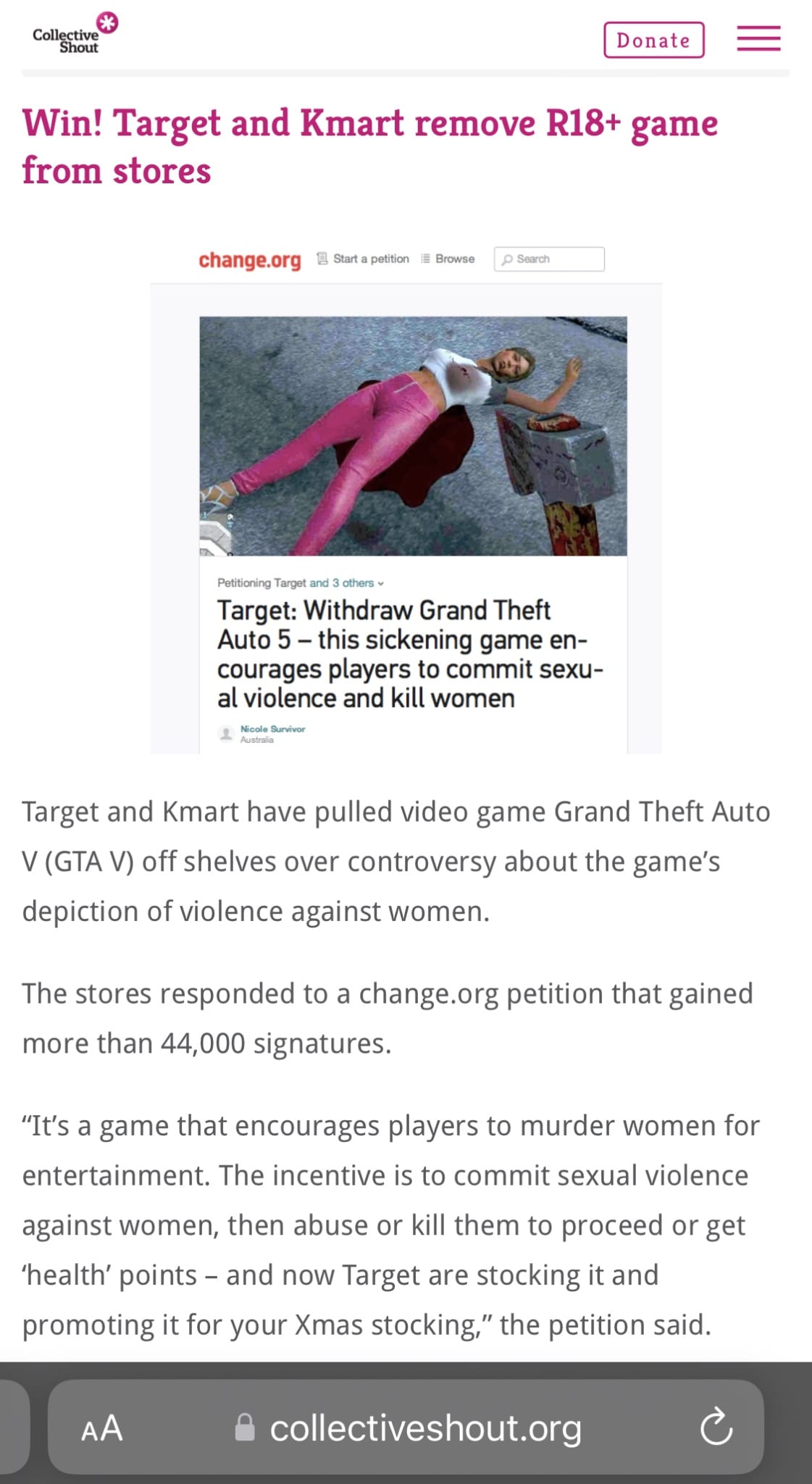 Collective Shout began in 2009, co-founded by self-described “pro-life feminist” Melinda Tankard Reist. Collective Shout describes itself as “A grassroots campaigning movement against the objectification of women and sexualization of girls in media, advertising, and popular culture”.