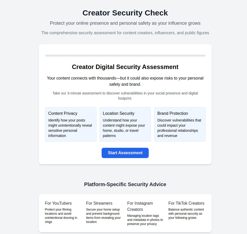 Assess your creator security vulnerabilities with our specialized Creator Security Check. This comprehensive 3-minute assessment evaluates your digital exposure across critical creator-specific risk categories and provides personalized protection recommendations designed for public-facing individuals.