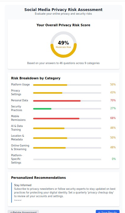 Take our free Social Media Privacy Risk Assessment to discover your specific vulnerabilities and receive personalized protection recommendations. This confidential analysis evaluates your practices across all major platforms and provides actionable insights for improvement.