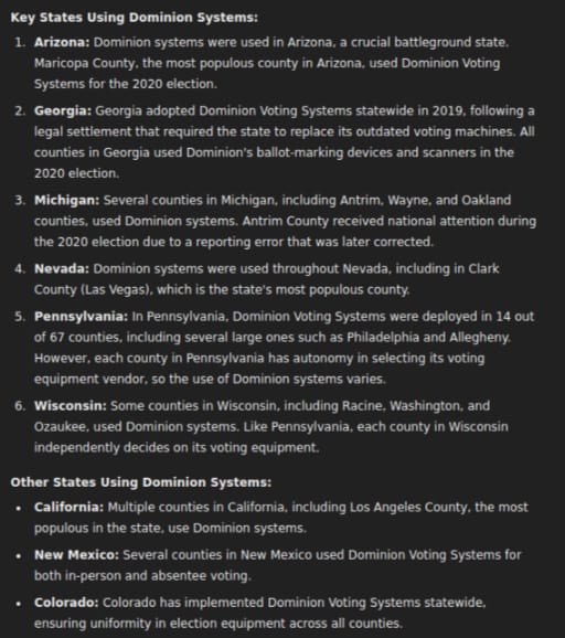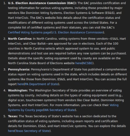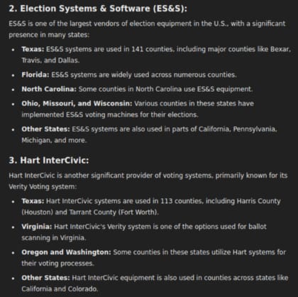 For example, Dominion Voting Systems is used in 28 states, including many battleground states like Georgia, Michigan, and Arizona. Meanwhile, ES&S serves numerous jurisdictions, including large states like Texas and Florida. Hart InterCivic is prevalent in Texas and Oregon, while Smartmatic has a limited presence, notably in Los Angeles County. Each state, or even county, may have its unique combination of systems and configurations, complicating efforts to implement standardized security measures across the board(CISA,CISA).