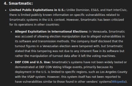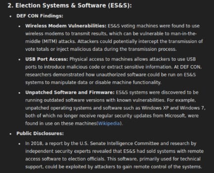 - Dominion Voting Systems: ImageCast X Vulnerabilities (2022): The ImageCast X system, an in-person voting machine used by Dominion, was found to have multiple vulnerabilities. These include improper verification of cryptographic signatures, hidden functionalities that could allow attackers to gain elevated privileges, and a path traversal vulnerability that could enable arbitrary code execution. Such vulnerabilities highlight the risks of unauthorized access, data tampering, and potential election interference(CISA,CISA,GitHub,GitHub).- Election Systems & Software (ES&S): ES&S machines, which are widely deployed in several states, have raised concerns over their use of wireless modems to transmit election results. While this practice helps streamline reporting, it could expose the system to man-in-the-middle (MITM) attacks, where attackers intercept or manipulate the transmitted data. Additionally, physical access to machines could allow attackers to exploit USB ports or outdated software to introduce malware(CISA).- Hart InterCivic and Smartmatic: While there have been fewer public disclosures of specific vulnerabilities against Hart InterCivic or Smartmatic since 2020, these systems are not immune to security concerns. Hart InterCivic’s decision to partner with Microsoft to integrate ElectionGuard, an open-source software toolkit, is a step toward enhancing security. Meanwhile, Smartmatic’s limited deployment in the U.S. means there have been fewer public tests or reports on its vulnerabilities compared to other vendors(U.S. Election Assistance Commission).