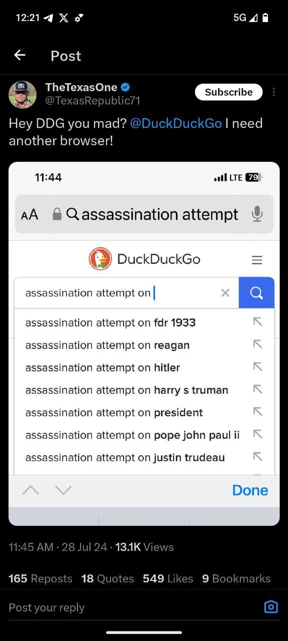 - Another post by End Wokeness shows a Google search for “assassination attempt on Trump” with autocomplete suggestions that do not include Trump, but rather historical figures and events.8. DuckDuckGo Search:
