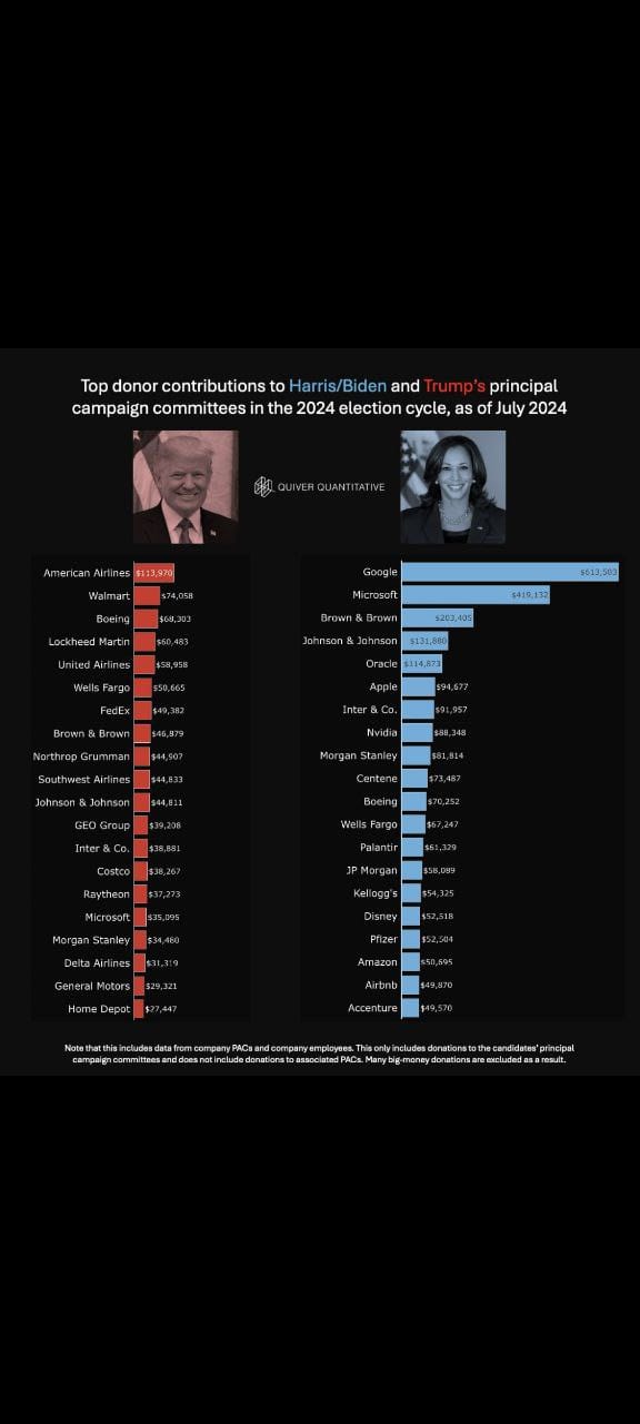 - The Trump campaign’s top donors include companies from the aviation, retail, and defense sectors, such as American Airlines, Walmart, and Lockheed Martin. While these companies may not have the same direct control over information platforms as tech companies, they can still exert influence over censorship policies through political channels.- Example: Defense contractors like Lockheed Martin might push for the suppression of anti-war content or critiques of military spending, using their influence to shape policies that favor their business interests.