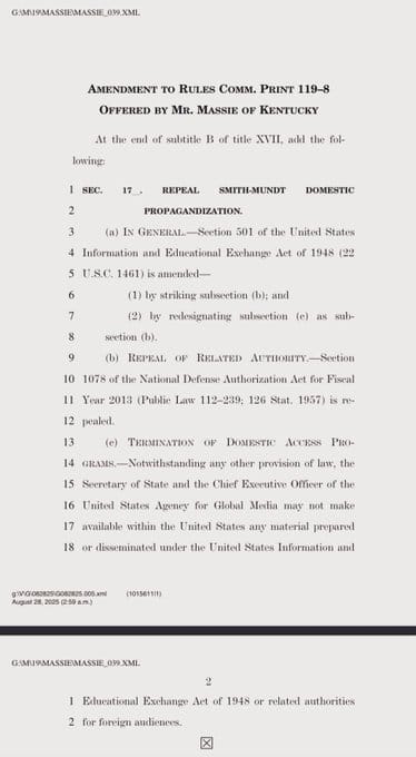 The quiet repeal of Smith-Mundtās domestic dissemination ban represents one of the most significant changes to American information policy in decades. Yet it occurred with minimal public awareness or debate. Thomas Massieās blocked amendment highlights how difficult it has become to reverse this expansion of government power.