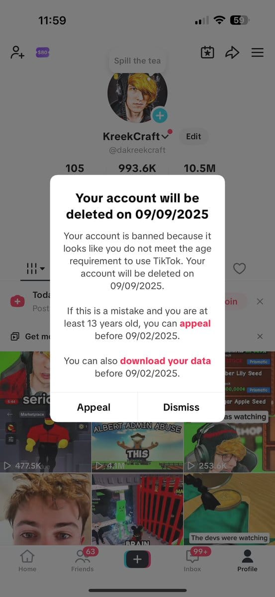 TikTok is currently implementing stricter age verification measures, automatically flagging and banning accounts they suspect belong to users under 13 years old. When an account is banned for being underage, users receive a push notification and an in-app message informing them of the account change, with typically 113 days (or 180 days in the EEA, or 23 days in the US) to submit an appeal.
