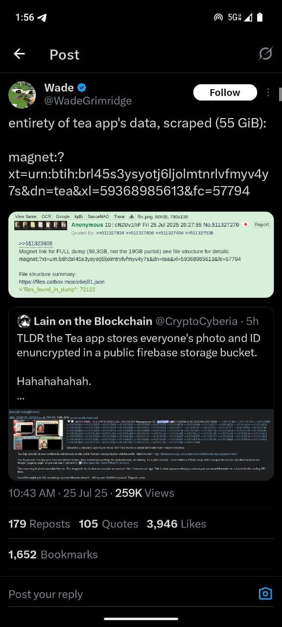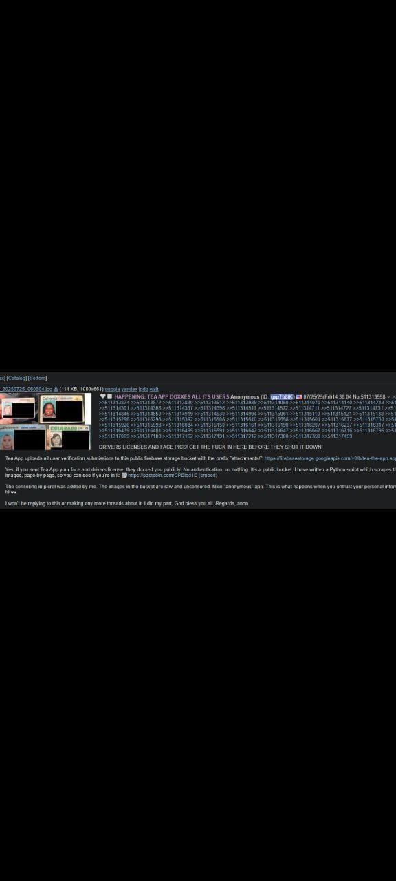 “Yes, if you sent Tea App your face and drivers license, they doxxed you publicly! No authentication, no nothing. It’s a public bucket,” read one 4chan post that included the vulnerable database link.