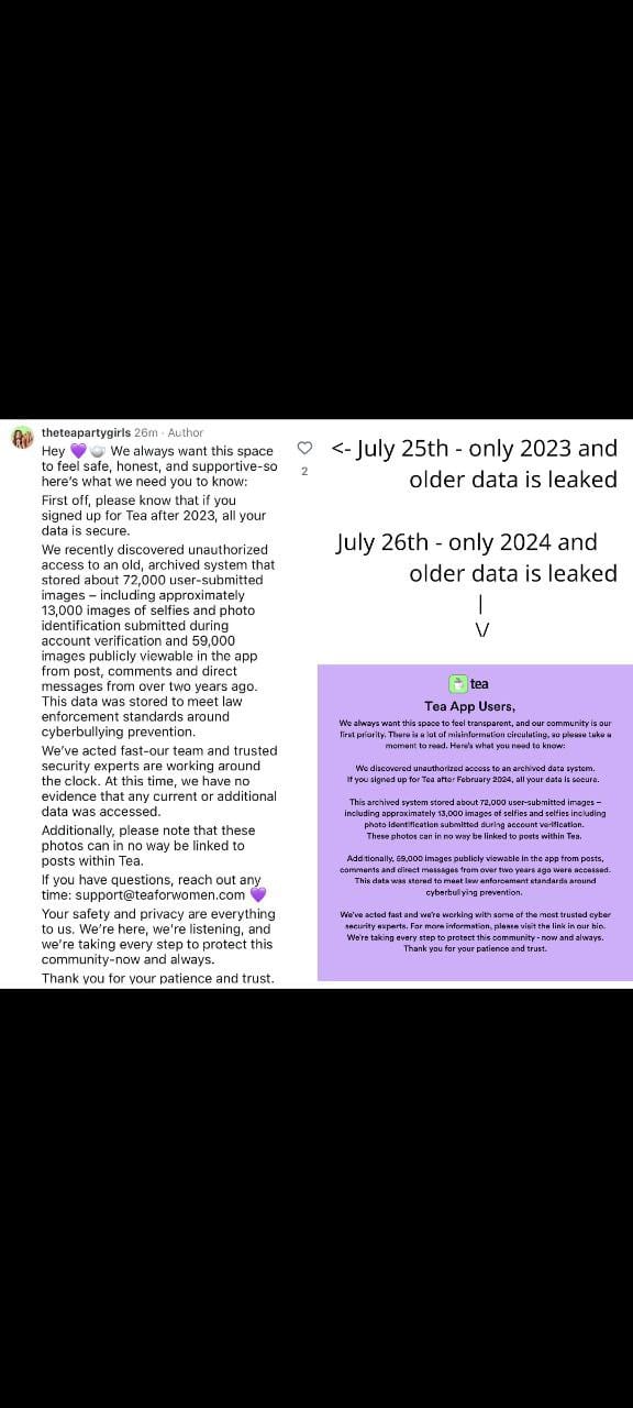 - Tea claimed: Only “legacy data from over two years ago” was affected- Reality: Messages accessed include content from as recently as last week