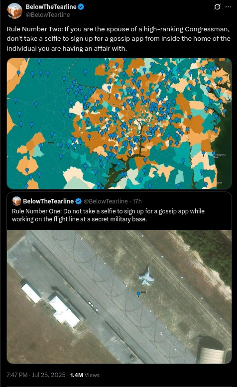 Rule Number Two: If you are the spouse of a high-ranking Congressman, don’t take a selfie to sign up for a gossip app from inside the home of the individual you are having an affair with. https://t.co/Rljo37G8lD pic.twitter.com/YGViGLFSIl— BelowTheTearline (@BelowTearline) July 25, 2025
