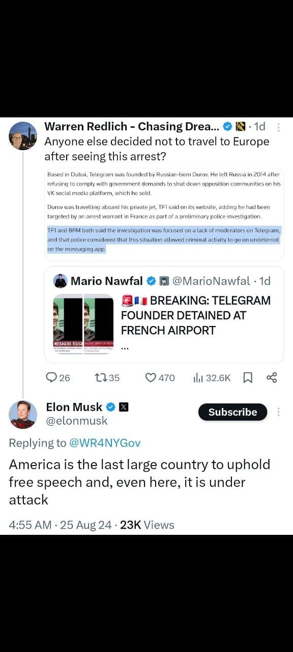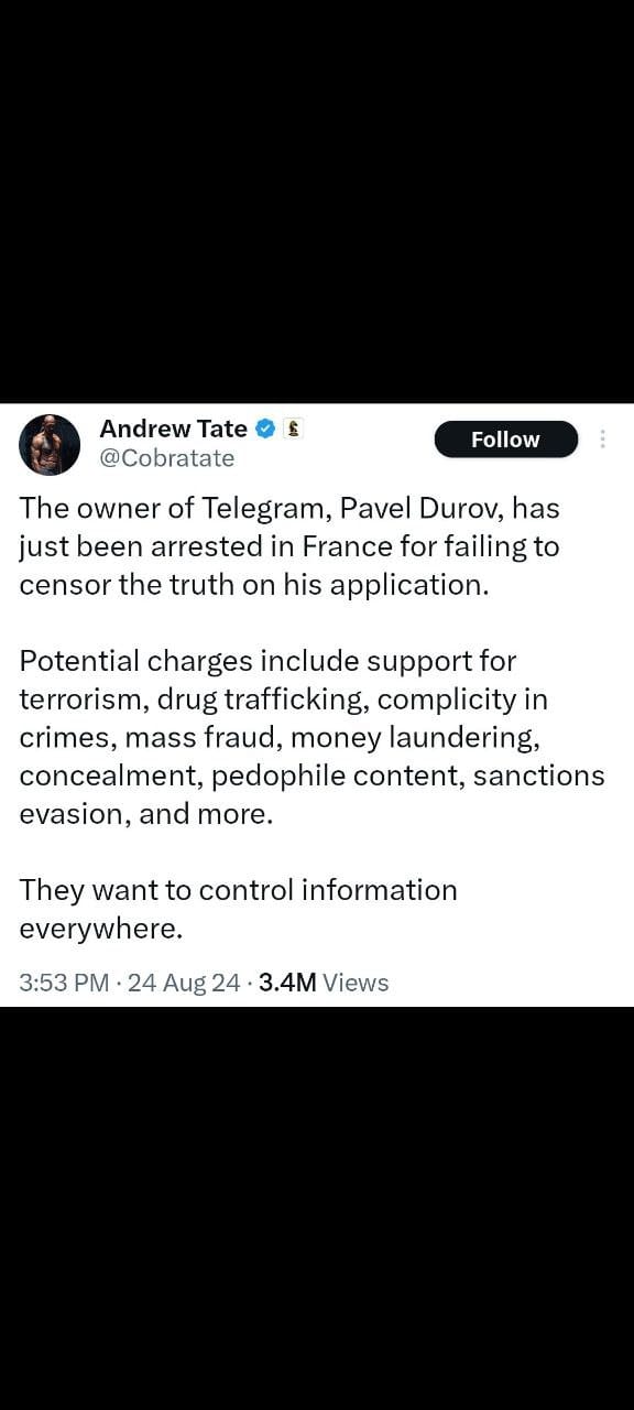 - Chris Pavlovski (Rumble CEO): Chris Pavlovski reacted to Pavel Durov’s arrest by sharing that he had left Europe for safety reasons. He criticized France for crossing a “red line” by arresting Durov for refusing to censor speech on Telegram. Pavlovski emphasized that Rumble will fight legally to protect freedom of expression and hopes for Durov’s immediate release.2. Andrew Tate: Andrew Tate shared that Pavel Durov was arrested in France for failing to censor content on Telegram, with potential charges including support for terrorism and other serious crimes. Tate suggested that the arrest was part of broader efforts to control information globally.3. Warren Redlich: Warren Redlich commented on Durov’s arrest, suggesting it might deter others from traveling to Europe. He provided background on Durov, including his past conflicts with the Russian government, and noted that the French investigation was concerned with a lack of moderation on Telegram, which authorities believe facilitated criminal activities.Elon Musk: Elon Musk responded to the situation by stating that America is the last large country to uphold free speech, though he warned that even in the U.S., free speech is under threat.