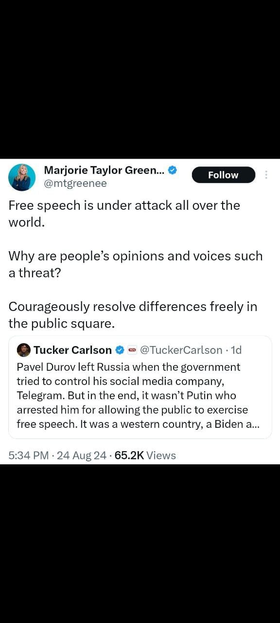 Edward Snowden: Edward Snowden condemned Durov’s arrest, describing it as an attack on fundamental human rights, such as freedom of speech and association. He criticized French President Emmanuel Macron for what Snowden views as a descent into using hostages to access private communications, which Snowden believes undermines not just France, but the world.Marjorie Taylor Greene: Marjorie Taylor Greene declared that free speech is under attack worldwide. She questioned why differing opinions are perceived as threats and called for resolving disagreements openly in public forums.